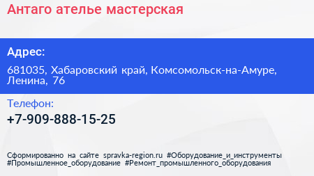 Антаго, ателье-мастерская по адресу 681035, Хабаровский край, Комсомольск-на-Амуре, Ленина, 76 в дальнейшем Организация, размещена в следующих категориях: