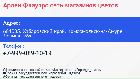 Арлен Флауэрс, сеть магазинов цветов по адресу 681035, Хабаровский край, Комсомольск-на-Амуре, Ленина, 76а в дальнейшем Организация, размещена в следующих категориях: