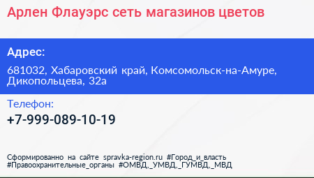 Арлен Флауэрс, сеть магазинов цветов по адресу 681032, Хабаровский край, Комсомольск-на-Амуре, Дикопольцева, 32а в дальнейшем Организация, размещена в следующих категориях: