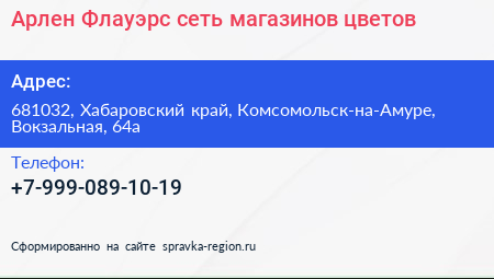 Арлен Флауэрс, сеть магазинов цветов по адресу 681032, Хабаровский край, Комсомольск-на-Амуре, Вокзальная, 64а в дальнейшем Организация, размещена в следующих категориях: