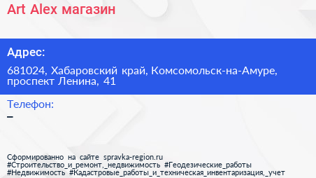 Art Alex, магазин по адресу 681024, Хабаровский край, Комсомольск-на-Амуре, проспект Ленина, 41 в дальнейшем Организация, размещена в следующих категориях: