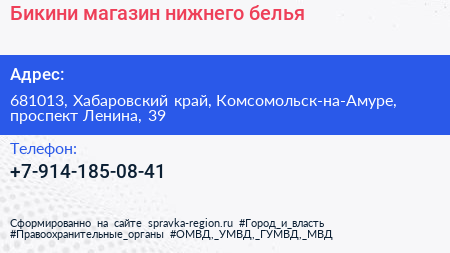Бикини, магазин нижнего белья по адресу 681013, Хабаровский край, Комсомольск-на-Амуре, проспект Ленина, 39 в дальнейшем Организация, размещена в следующих категориях: