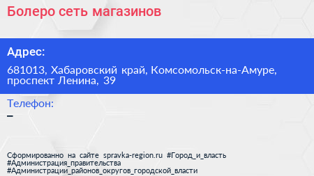 Болеро, сеть магазинов по адресу 681013, Хабаровский край, Комсомольск-на-Амуре, проспект Ленина, 39 в дальнейшем Организация, размещена в следующих категориях: