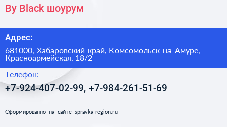 By Black, шоурум по адресу 681000, Хабаровский край, Комсомольск-на-Амуре, Красноармейская, 18/2 в дальнейшем Организация, размещена в следующих категориях: