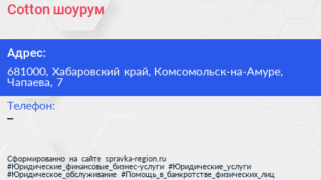 Cotton, шоурум по адресу 681000, Хабаровский край, Комсомольск-на-Амуре, Чапаева, 7 в дальнейшем Организация, размещена в следующих категориях: