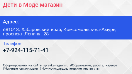 Дети в Моде, магазин по адресу 681013, Хабаровский край, Комсомольск-на-Амуре, проспект Ленина, 28 в дальнейшем Организация, размещена в следующих категориях:
