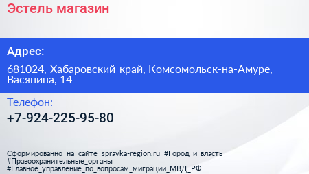 Эстель, магазин по адресу 681024, Хабаровский край, Комсомольск-на-Амуре, Васянина, 14 в дальнейшем Организация, размещена в следующих категориях: