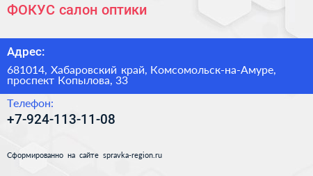 ФОКУС, салон оптики по адресу 681014, Хабаровский край, Комсомольск-на-Амуре, проспект Копылова, 33 в дальнейшем Организация, размещена в следующих категориях: