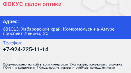 ФОКУС, салон оптики по адресу 681013, Хабаровский край, Комсомольск-на-Амуре, проспект Ленина, 30 в дальнейшем Организация, размещена в следующих категориях: