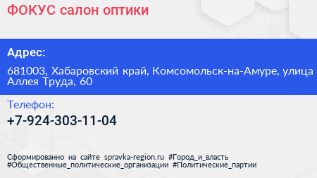ФОКУС, салон оптики по адресу 681003, Хабаровский край, Комсомольск-на-Амуре, улица Аллея Труда, 60 в дальнейшем Организация, размещена в следующих категориях: