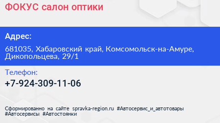 ФОКУС, салон оптики по адресу 681035, Хабаровский край, Комсомольск-на-Амуре, Дикопольцева, 29/1 в дальнейшем Организация, размещена в следующих категориях: