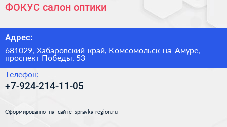 ФОКУС, салон оптики по адресу 681029, Хабаровский край, Комсомольск-на-Амуре, проспект Победы, 53 в дальнейшем Организация, размещена в следующих категориях: