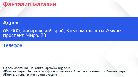 Фантазия, магазин по адресу 681000, Хабаровский край, Комсомольск-на-Амуре, проспект Мира, 28 в дальнейшем Организация, размещена в следующих категориях: