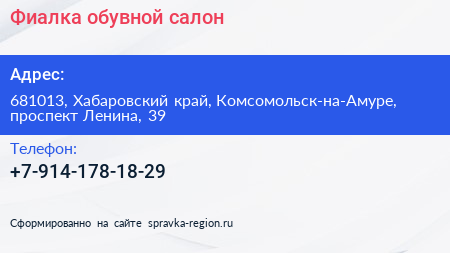 Фиалка, обувной салон по адресу 681013, Хабаровский край, Комсомольск-на-Амуре, проспект Ленина, 39 в дальнейшем Организация, размещена в следующих категориях:
