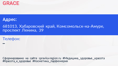 GRACE по адресу 681013, Хабаровский край, Комсомольск-на-Амуре, проспект Ленина, 39 в дальнейшем Организация, размещена в следующих категориях: