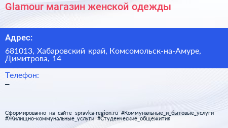 Glamour, магазин женской одежды по адресу 681013, Хабаровский край, Комсомольск-на-Амуре, Димитрова, 14 в дальнейшем Организация, размещена в следующих категориях: