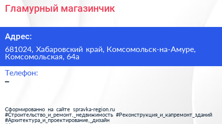 Гламурный магазинчик по адресу 681024, Хабаровский край, Комсомольск-на-Амуре, Комсомольская, 64а в дальнейшем Организация, размещена в следующих категориях: