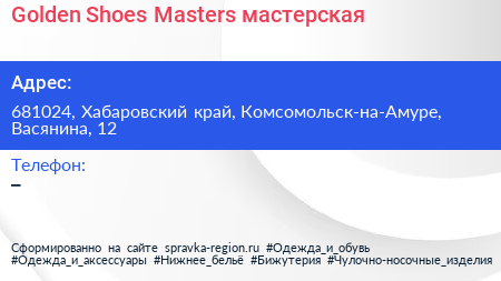 Golden Shoes Masters, мастерская по адресу 681024, Хабаровский край, Комсомольск-на-Амуре, Васянина, 12 в дальнейшем Организация, размещена в следующих категориях: