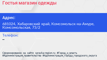 Гостья, магазин одежды по адресу 681024, Хабаровский край, Комсомольск-на-Амуре, Комсомольская, 73/2 в дальнейшем Организация, размещена в следующих категориях: