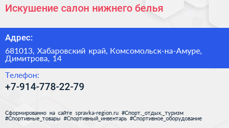 Искушение, салон нижнего белья по адресу 681013, Хабаровский край, Комсомольск-на-Амуре, Димитрова, 14 в дальнейшем Организация, размещена в следующих категориях: