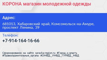 КОРОНА, магазин молодежной одежды по адресу 681013, Хабаровский край, Комсомольск-на-Амуре, проспект Ленина, 39 в дальнейшем Организация, размещена в следующих категориях: