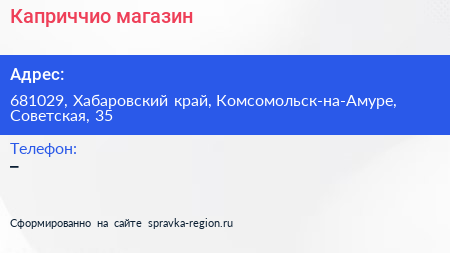 Каприччио, магазин по адресу 681029, Хабаровский край, Комсомольск-на-Амуре, Советская, 35 в дальнейшем Организация, размещена в следующих категориях: