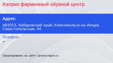 Каприз, фирменный обувной центр по адресу 681013, Хабаровский край, Комсомольск-на-Амуре, Севастопольская, 44 в дальнейшем Организация, размещена в следующих категориях: