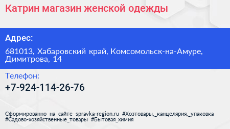 Катрин, магазин женской одежды по адресу 681013, Хабаровский край, Комсомольск-на-Амуре, Димитрова, 14 в дальнейшем Организация, размещена в следующих категориях: