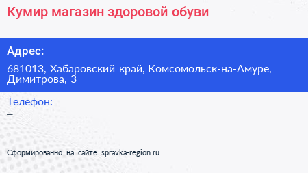 Кумир, магазин здоровой обуви по адресу 681013, Хабаровский край, Комсомольск-на-Амуре, Димитрова, 3 в дальнейшем Организация, размещена в следующих категориях: