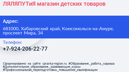 ЛЯЛЯПУТиЯ, магазин детских товаров по адресу 681000, Хабаровский край, Комсомольск-на-Амуре, проспект Мира, 34 в дальнейшем Организация, размещена в следующих категориях: