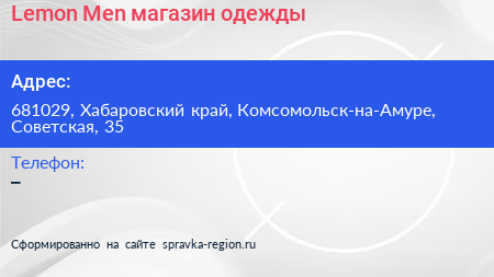 Lemon Men, магазин одежды по адресу 681029, Хабаровский край, Комсомольск-на-Амуре, Советская, 35 в дальнейшем Организация, размещена в следующих категориях: