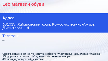 Leo, магазин обуви по адресу 681013, Хабаровский край, Комсомольск-на-Амуре, Димитрова, 14 в дальнейшем Организация, размещена в следующих категориях: