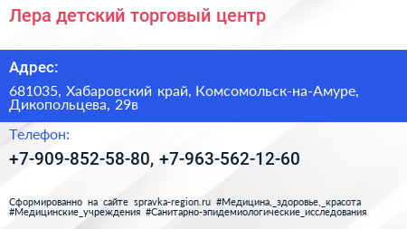 Лера, детский торговый центр по адресу 681035, Хабаровский край, Комсомольск-на-Амуре, Дикопольцева, 29в в дальнейшем Организация, размещена в следующих категориях: