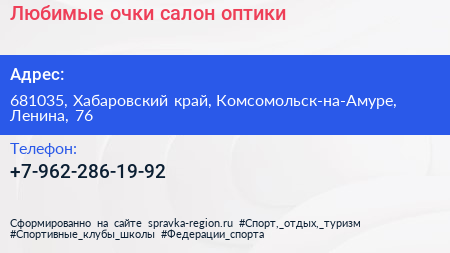 Любимые очки, салон оптики по адресу 681035, Хабаровский край, Комсомольск-на-Амуре, Ленина, 76 в дальнейшем Организация, размещена в следующих категориях: