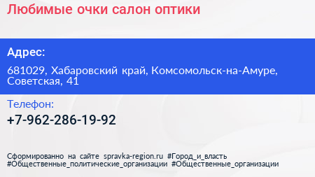 Любимые очки, салон оптики по адресу 681029, Хабаровский край, Комсомольск-на-Амуре, Советская, 41 в дальнейшем Организация, размещена в следующих категориях: