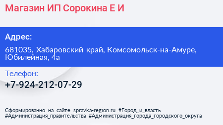 Магазин, ИП Сорокина Е.И. по адресу 681035, Хабаровский край, Комсомольск-на-Амуре, Юбилейная, 4а в дальнейшем Организация, размещена в следующих категориях: