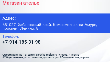 Магазин-ателье по адресу 681027, Хабаровский край, Комсомольск-на-Амуре, проспект Ленина, 8 в дальнейшем Организация, размещена в следующих категориях: