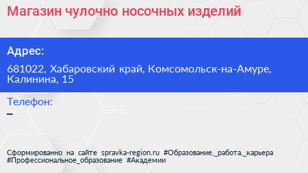 Магазин чулочно-носочных изделий по адресу 681022, Хабаровский край, Комсомольск-на-Амуре, Калинина, 15 в дальнейшем Организация, размещена в следующих категориях: