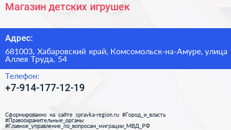 Магазин детских игрушек по адресу 681003, Хабаровский край, Комсомольск-на-Амуре, улица Аллея Труда, 54 в дальнейшем Организация, размещена в следующих категориях: