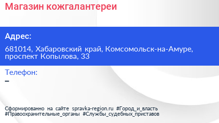 Магазин кожгалантереи по адресу 681014, Хабаровский край, Комсомольск-на-Амуре, проспект Копылова, 33 в дальнейшем Организация, размещена в следующих категориях: