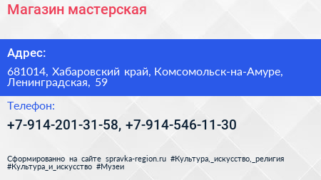 Магазин-мастерская по адресу 681014, Хабаровский край, Комсомольск-на-Амуре, Ленинградская, 59 в дальнейшем Организация, размещена в следующих категориях: