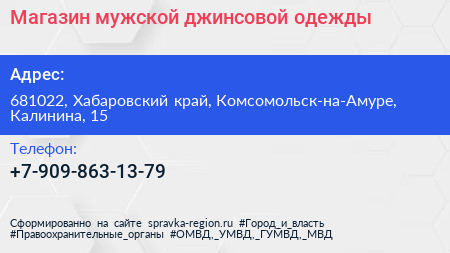 Магазин мужской джинсовой одежды по адресу 681022, Хабаровский край, Комсомольск-на-Амуре, Калинина, 15 в дальнейшем Организация, размещена в следующих категориях: