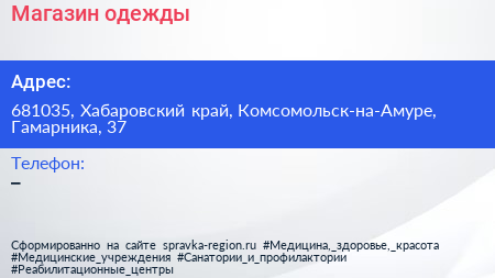 Магазин одежды по адресу 681035, Хабаровский край, Комсомольск-на-Амуре, Гамарника, 37 в дальнейшем Организация, размещена в следующих категориях: