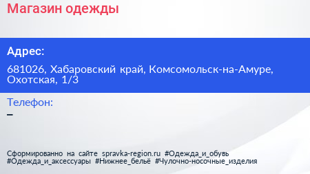 Магазин одежды по адресу 681026, Хабаровский край, Комсомольск-на-Амуре, Охотская, 1/3 в дальнейшем Организация, размещена в следующих категориях: