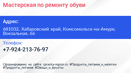 Мастерская по ремонту обуви по адресу 681032, Хабаровский край, Комсомольск-на-Амуре, Вокзальная, 66 в дальнейшем Организация, размещена в следующих категориях: