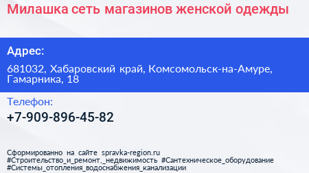Милашка, сеть магазинов женской одежды по адресу 681032, Хабаровский край, Комсомольск-на-Амуре, Гамарника, 18 в дальнейшем Организация, размещена в следующих категориях: