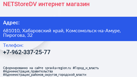 NETStoreDV, интернет-магазин по адресу 681010, Хабаровский край, Комсомольск-на-Амуре, Пирогова, 32 в дальнейшем Организация, размещена в следующих категориях: