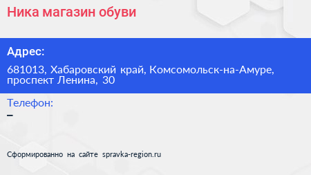 Ника, магазин обуви по адресу 681013, Хабаровский край, Комсомольск-на-Амуре, проспект Ленина, 30 в дальнейшем Организация, размещена в следующих категориях: