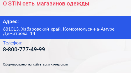 O`STIN, сеть магазинов одежды по адресу 681013, Хабаровский край, Комсомольск-на-Амуре, Димитрова, 14 в дальнейшем Организация, размещена в следующих категориях: