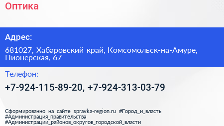Оптика по адресу 681027, Хабаровский край, Комсомольск-на-Амуре, Пионерская, 67 в дальнейшем Организация, размещена в следующих категориях: